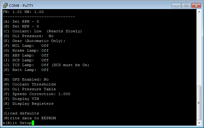 Most of the menus are straightforward (and options may change as the firmware evolves). Each letter surrounded by a parentheses is a menu option. If you are connecting to the circuit while the cluster is connected and powered you can manipulate the instrument cluster with the first section. The second section relates to settings that will need to be saved with the "(W)rite to EEPROM" option. Display VIN and Display Registers are used for troubleshooting purposes.