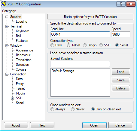 Now that we know our COM port the next step is to install a Serial Terminal - if you're computer savvy, any terminal will do. PuTTY is free application that works extremely well. You can download it here. Once installed, open the application and select "Serial" - Change the Serial Line to the COM port noted above. Baud rate defaults to 9600.